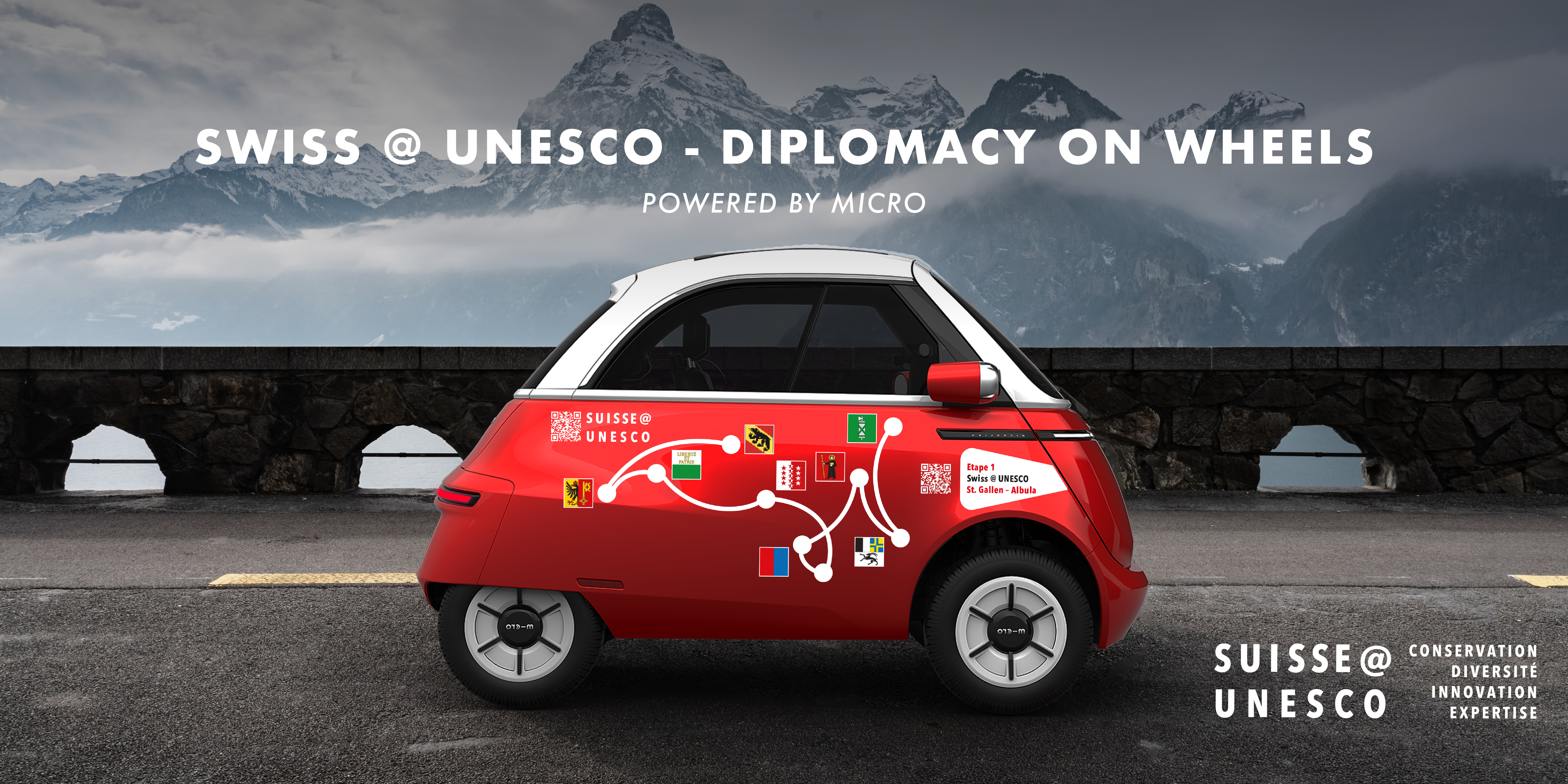 What happens when Swiss diplomacy meets sustainable mobility? That’s exactly what we’re experiencing this summer with SWISS@UNESCO – Diplomacy on Wheels. Switzerland’s new UNESCO Ambassador, Benedikt Wechsler, is embarking on a very special tour – behind the wheel of a Microlino!