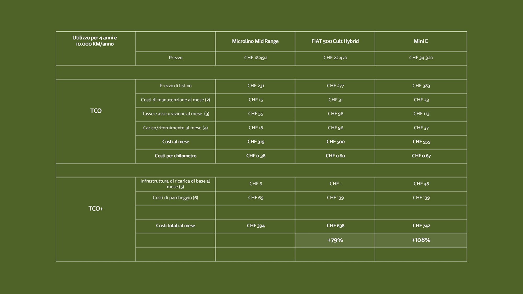 TCO è l'acronimo di "Total Cost of Ownership" e si riferisce all'analisi dei costi totali di un veicolo aziendale. Non viene preso in considerazione solo il prezzo del veicolo, ma tutti i costi nell'arco dell'intera vita utile. L'importanza dei singoli fattori di costo varia notevolmente a seconda del veicolo e del suo utilizzo. Fattori come l'ammortamento, il carburante, la manutenzione e i costi assicurativi possono variare notevolmente. (1) I costi di ammortamento rappresentano i costi di ammortamento mensili con un valore residuo del 40% dopo 4 anni e 10.000 km all'anno. Il valore residuo è applicato a tutti i modelli indicati per comparabilità. (2) I costi di manutenzione sono i costi mensili previsti per la manutenzione o la sostituzione delle parti soggette a usura durante la vita utile. (3) Per le tasse e i costi assicurativi sono stati confrontati i valori medi dei 5 cantoni con il maggior numero di veicoli immatricolati. (4) I costi energetici si basano sui dati di consumo del costruttore e sui costi energetici correnti per l'elettricità o i combustibili fossili. (5) Per i costi dell'infrastruttura di ricarica, sono stati presi in considerazione il caricatore ICCB offerto da Microlino (prezzo lordo di 399 franchi) e i costi medi di hardware e installazione per l'installazione di una semplice soluzione di ricarica wallbox. (6) I costi di parcheggio sono stati confrontati con i costi prevedibili in base alle esigenze di parcheggio (in base alle dimensioni del veicolo).