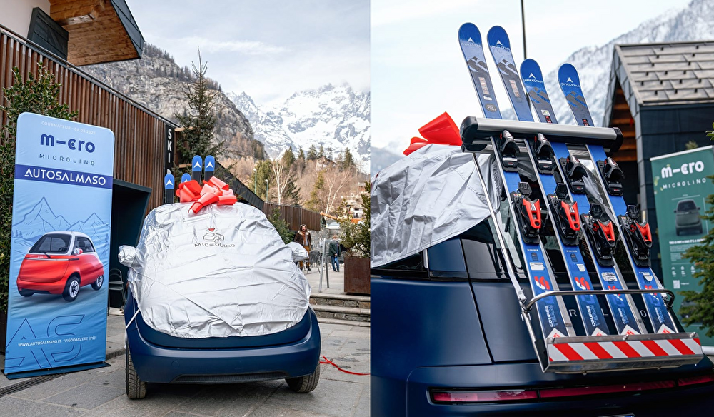 Con la splendida cornice del Monte Bianco, una persona molto fortunata ha ricevuto il regalo che forse tutti gli amanti della montagna vorrebbero avere: una Microlino con un portasci dedicato!