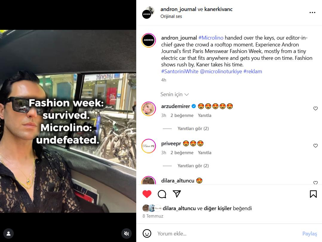 Kaner Kıvanç, Editor-in-Chief of Andron Journal, arrived at major shows behind the wheel of a Microlino. From the venue entrances to the bustling streets filled with photographers, the Microlino turned heads and sparked conversations. Its compact, retro-modern design stood out in a city that celebrates individuality and bold style choices.